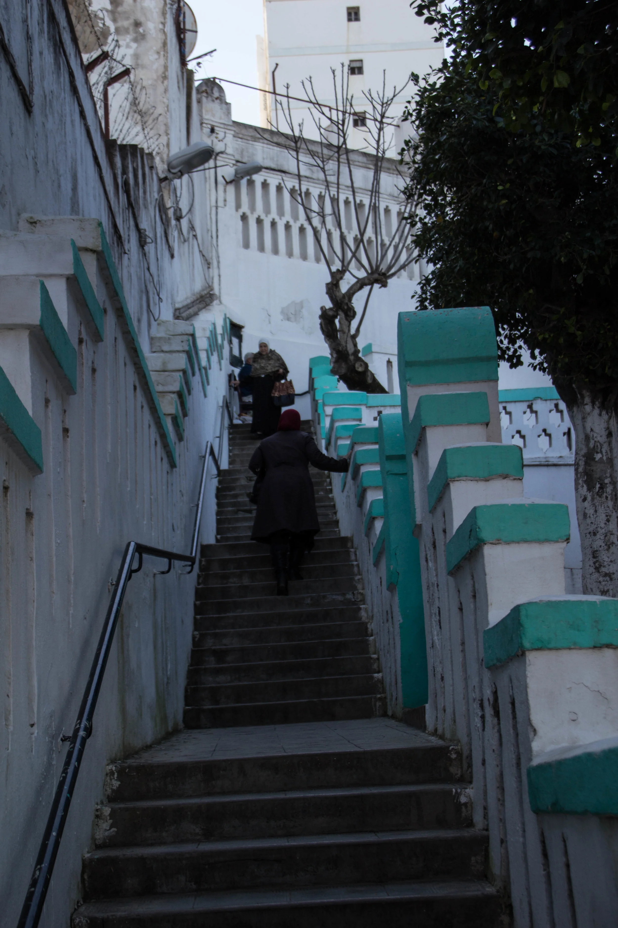In Algeria's war for independence from France (1954-1966), much of the Battle for Algiers was famously fought here in the Casbah. Algerians used their knowledge of these windings streets to their advantage in fighting against the French, and as you can probably guess, came out victorious. There's a famous Italian movie that was shot here shortly afterwards (also in 1966) called The Battle of Algiers that locals all seemed very proud of, even in 2018. Shown here is one of the most famous frames from that movie—these two are sitting on a typical Casbah staircase. Things look pretty much the same half a century later.