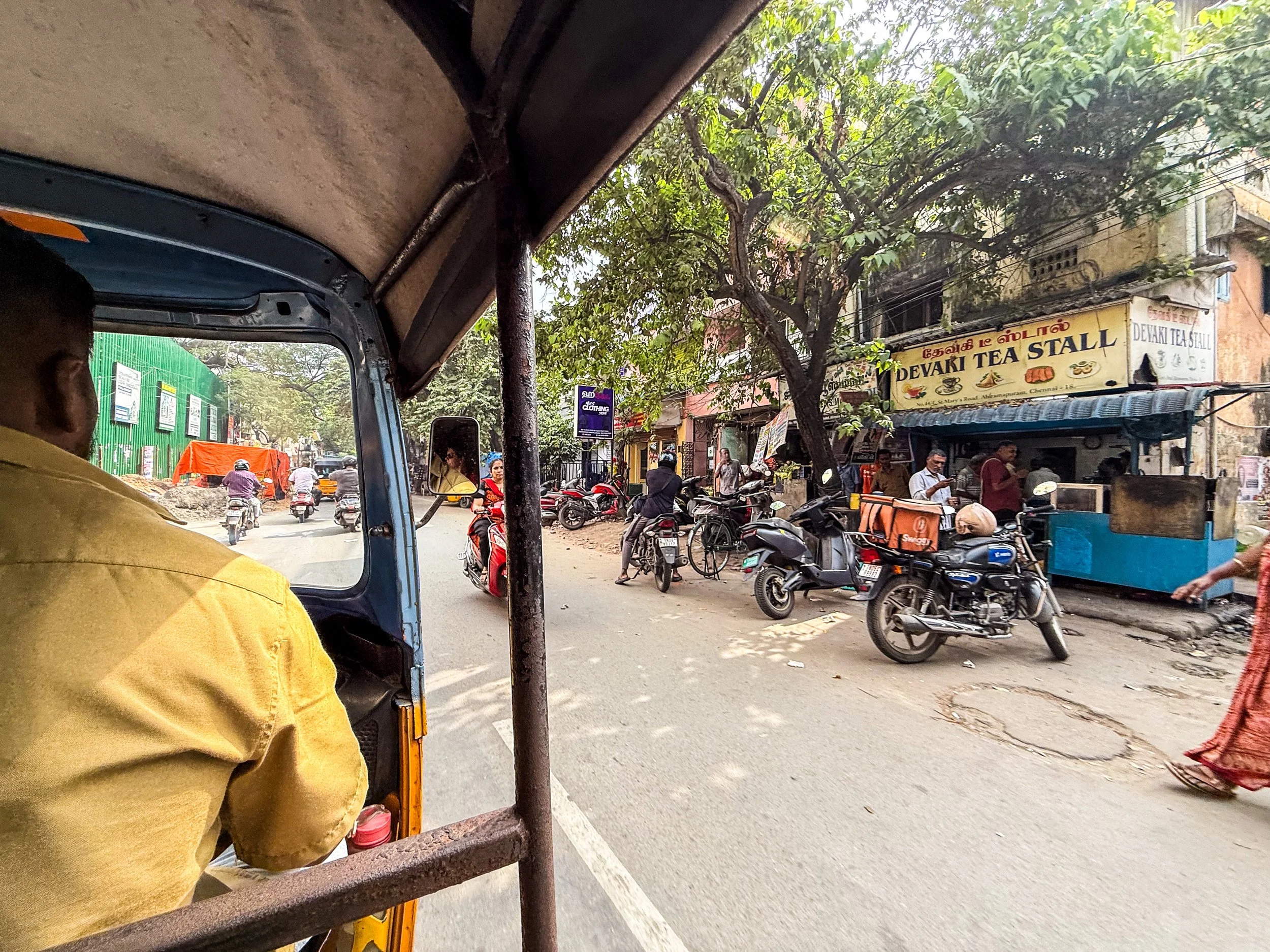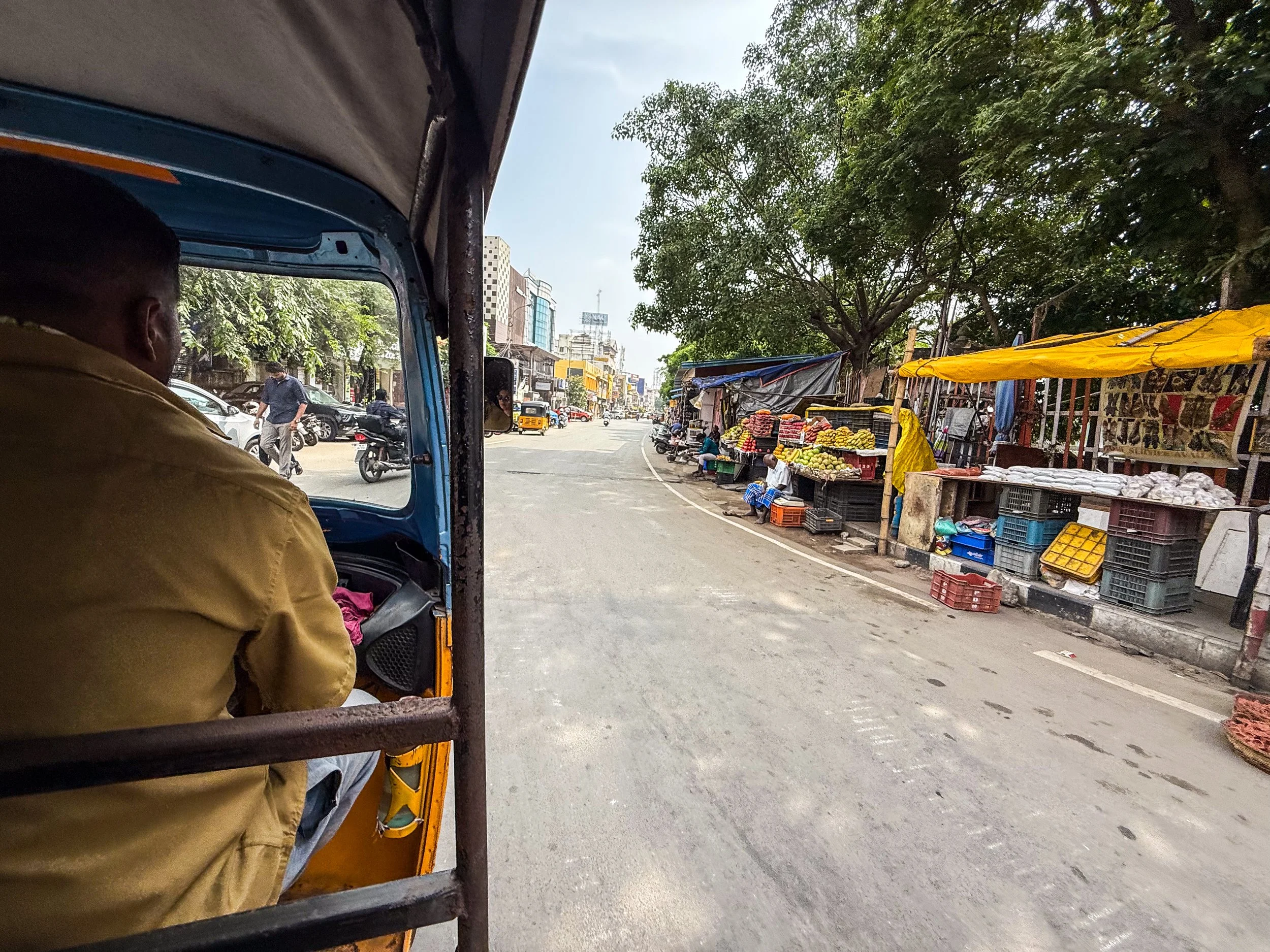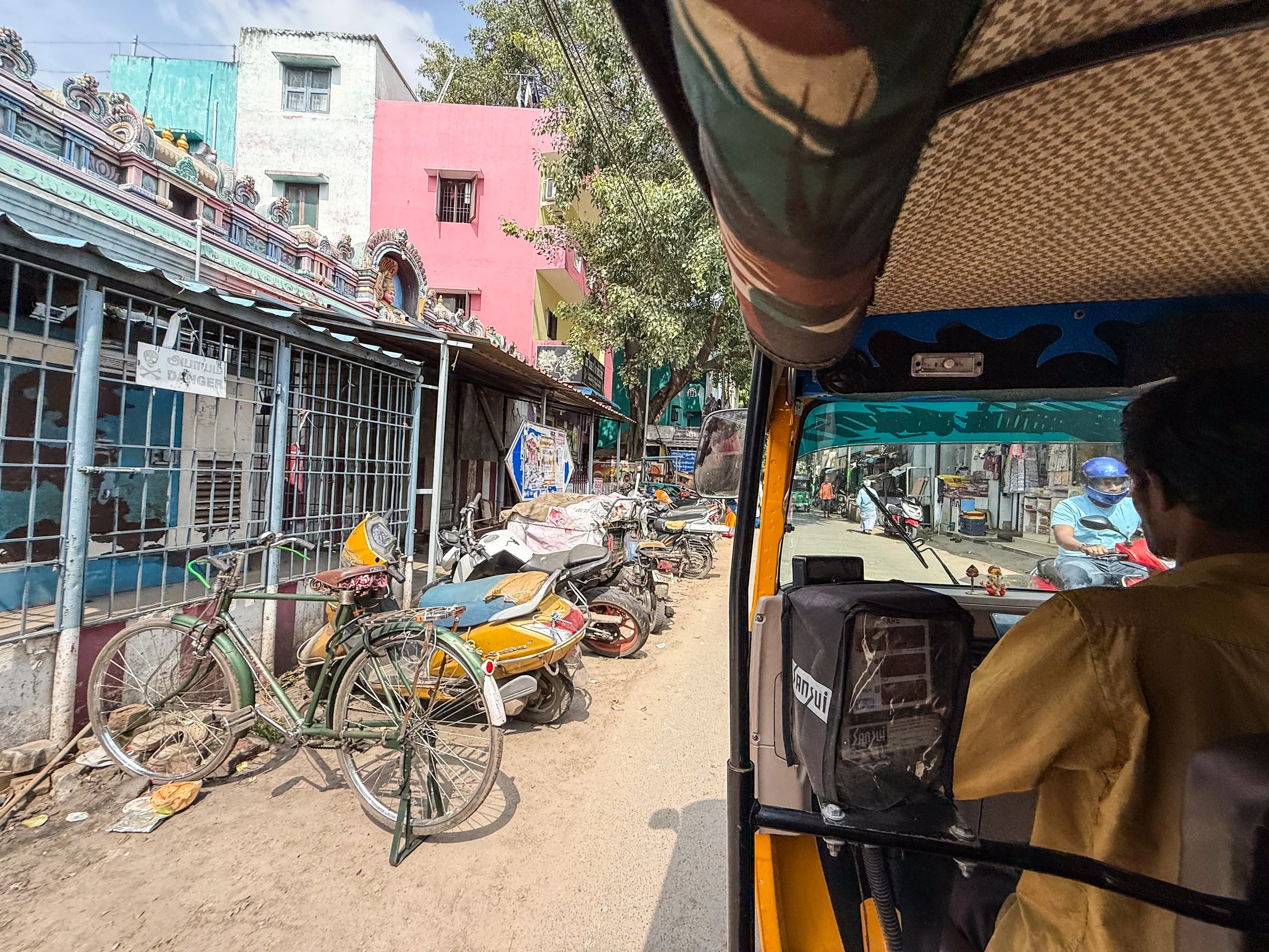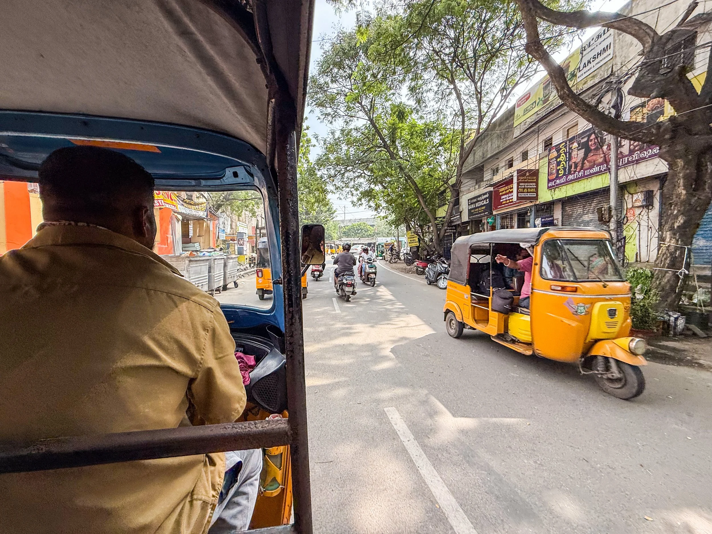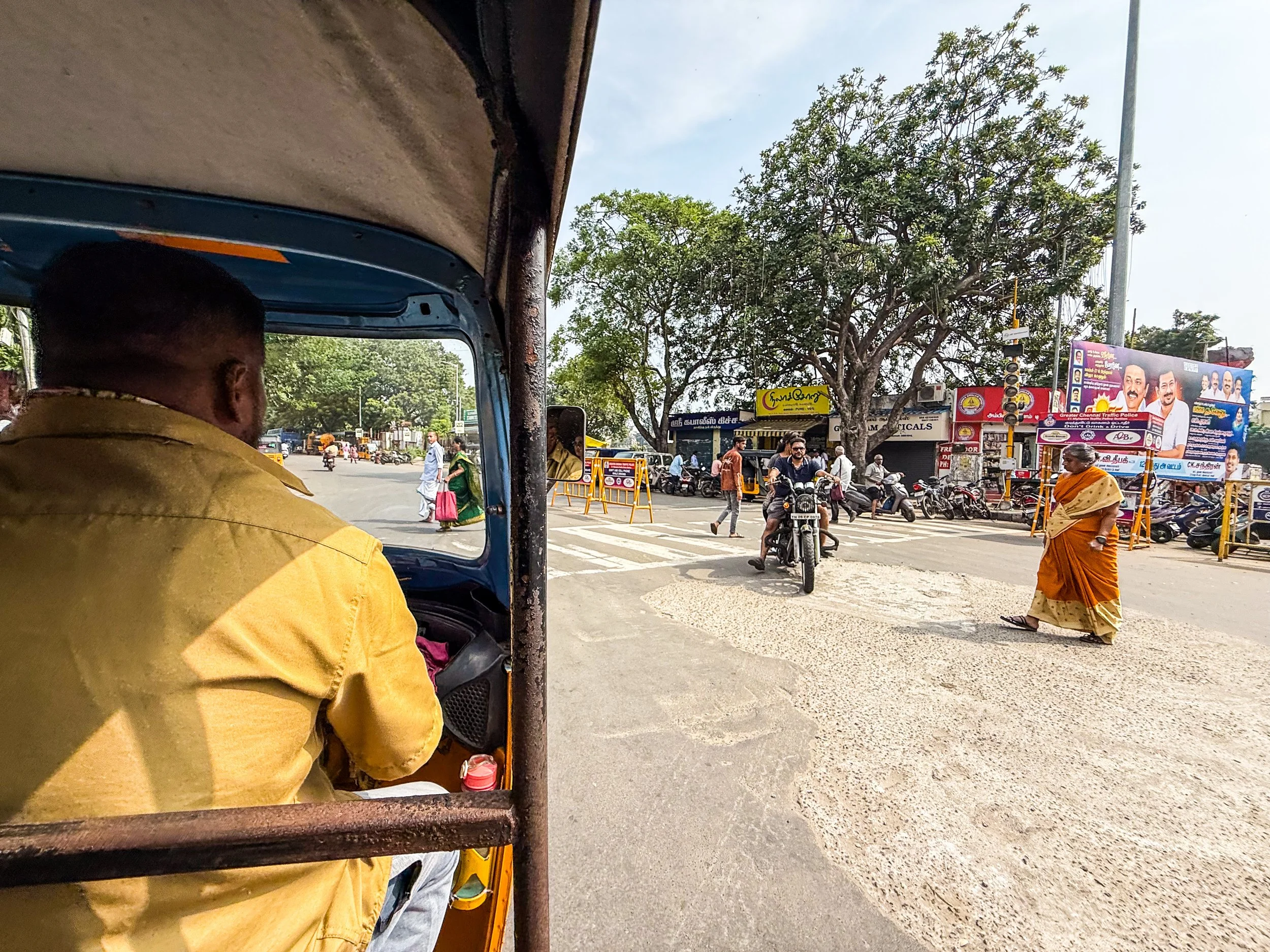 Chennai was the first time that I realised that you can now call rickshaws on Uber! They’re a helluva lot cheaper than normal cars, and they are a much more “Indian” experience, so we took them everywhere in Chennai. With the exception of the final night when we made the mistake of taking a rickshaw through a rainstorm, it was quite fun. The ceilings and dashboards of many of these little vehicles had been decorated to reflect the personalities of their drivers, which is not something I’d seen elsewhere in India. Here’s a gallery of the views from the back of these noisy little golf carts as they drove us back and forth across Chennai. I can still feel the warm breeze hitting my face and hear the sounds of the street when I look at these pictures…