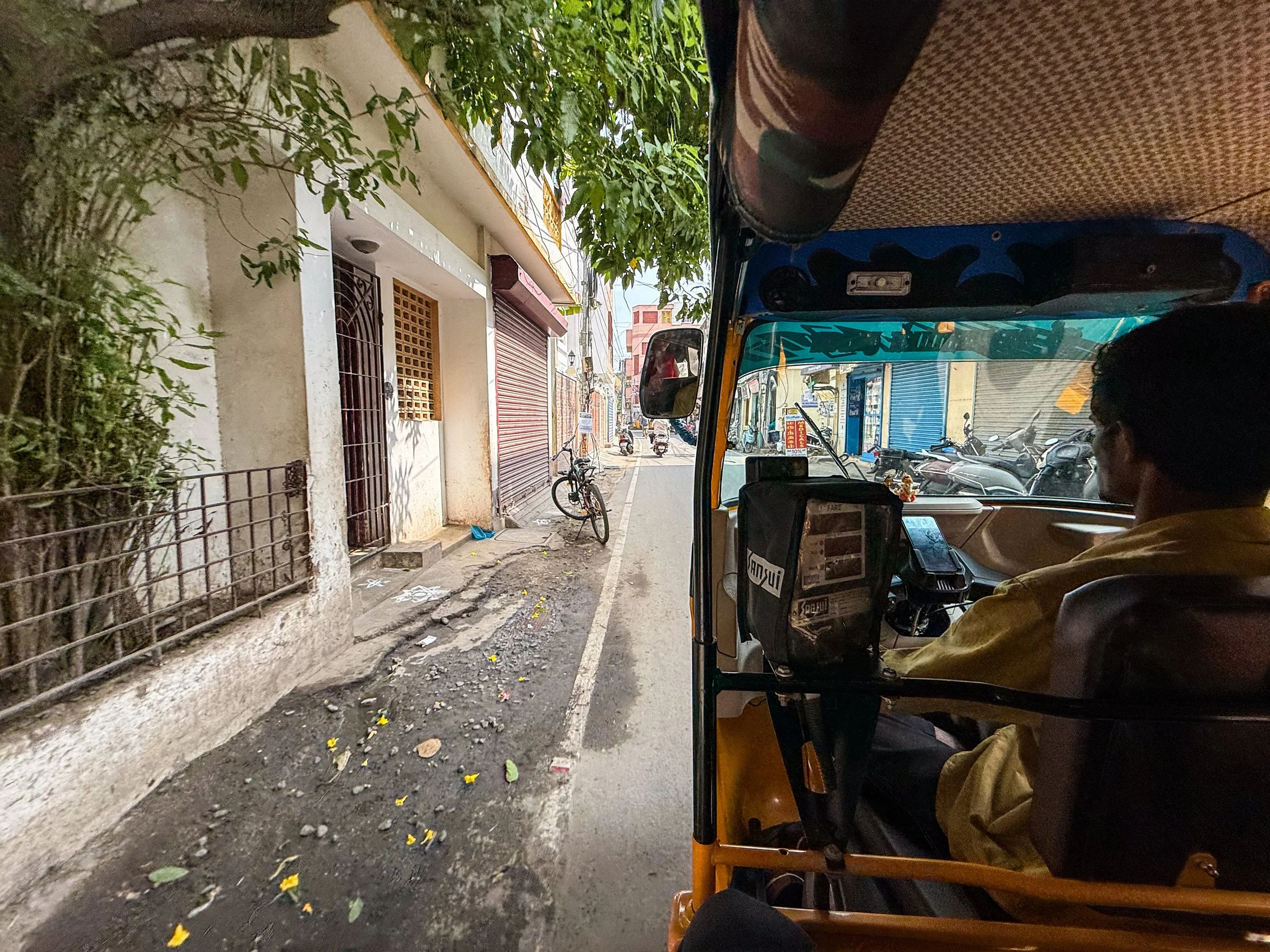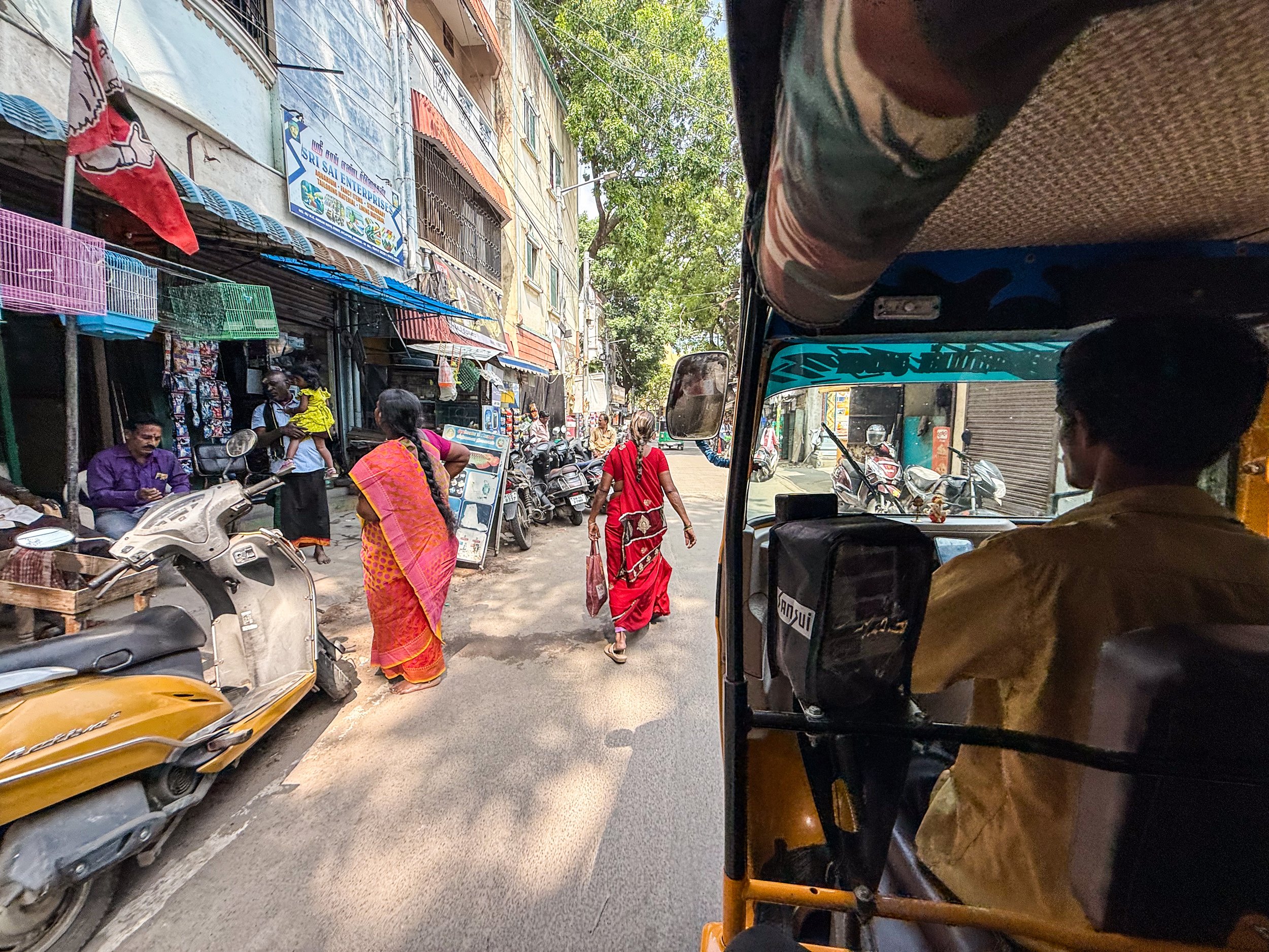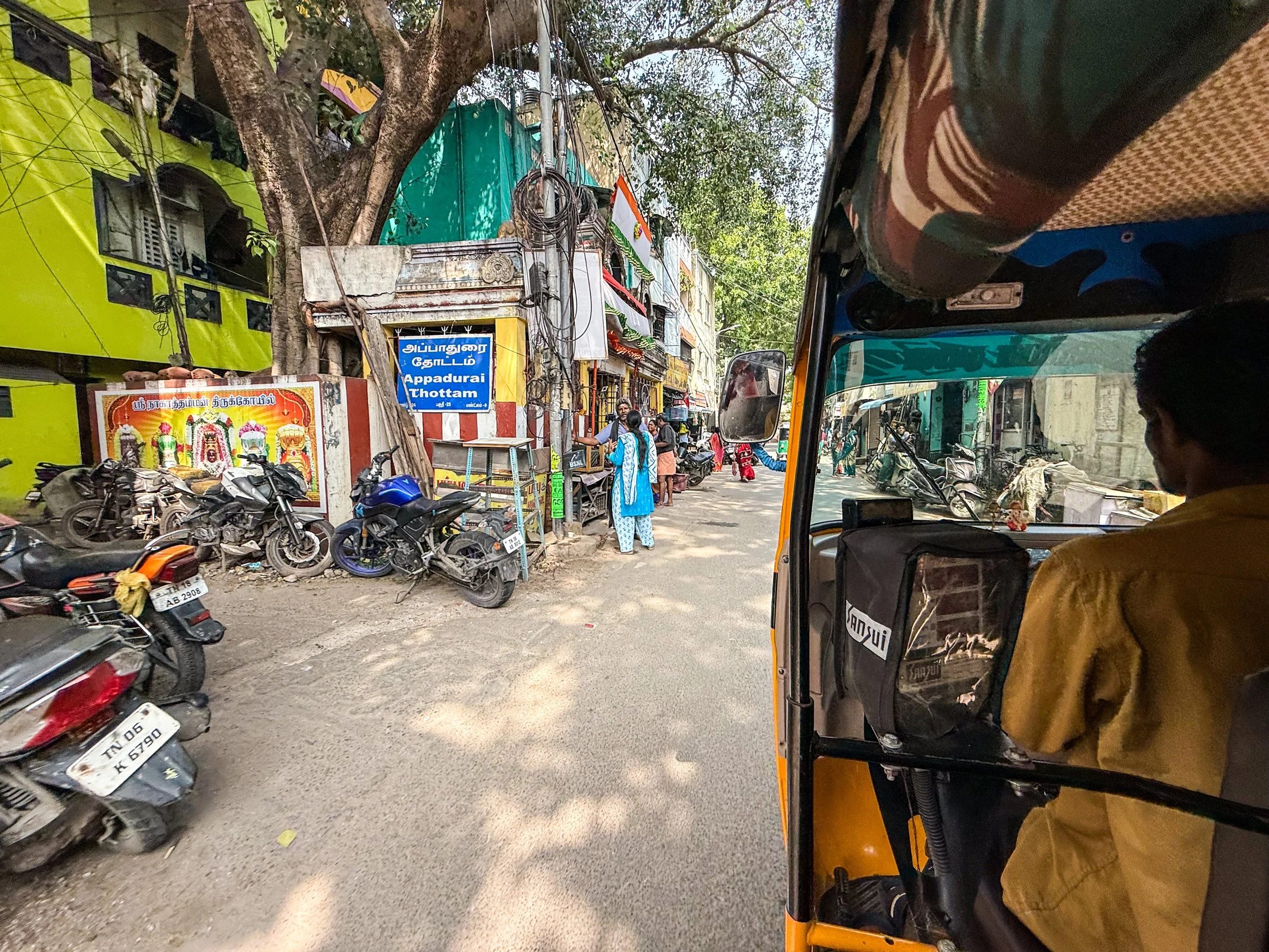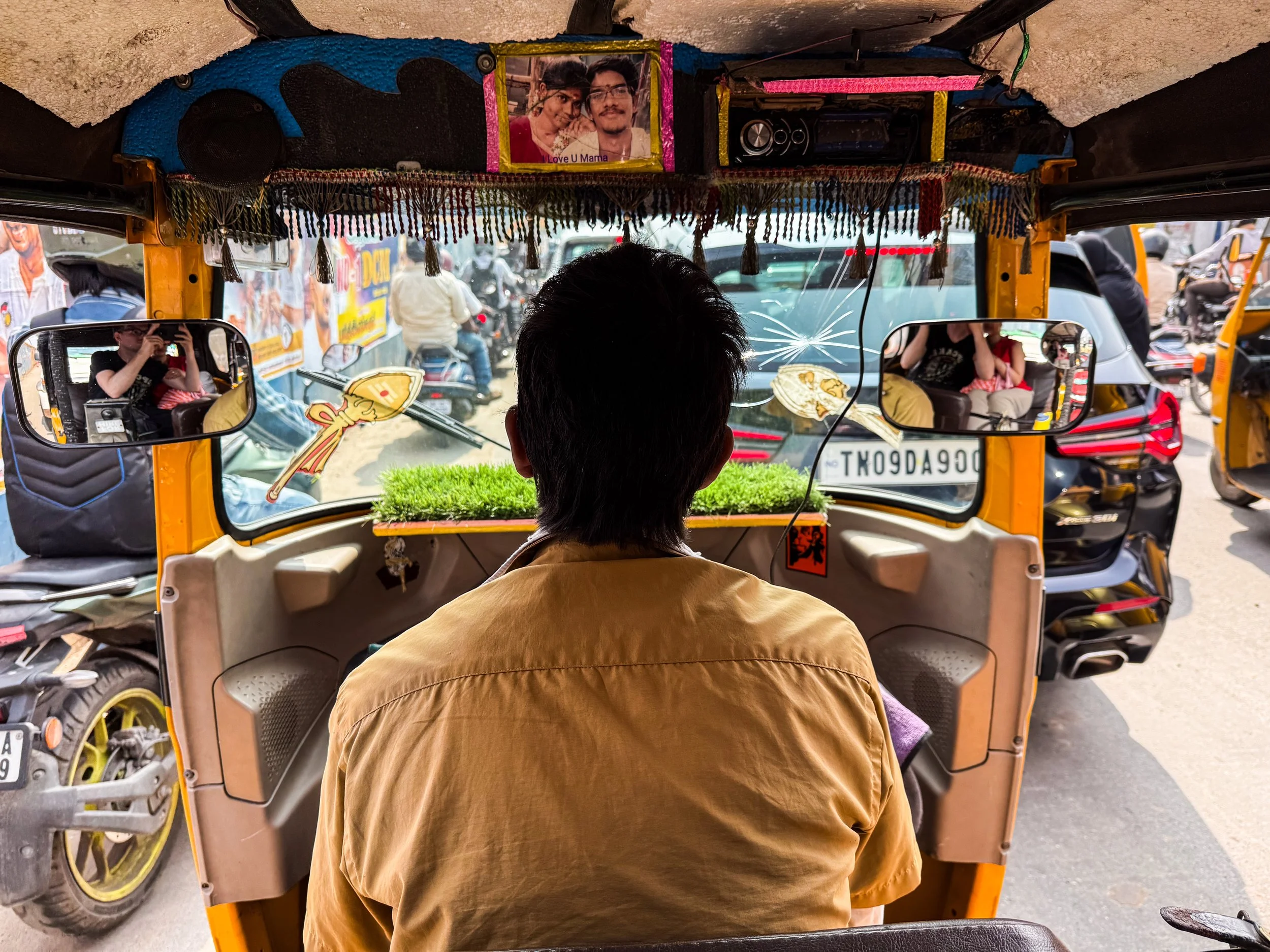 Anyway, amidst the many regional differences/nuances at play within India, I think the North/South divide is one of the most basic and pronounced. Northern cities have the reputation of embodying India at its most crowded, frenetic, and… dare I say… unpleasant? There’s a lot to love up there as well of course, but it can be challenging. The reputation of the South of India is for being music more peaceful and laid back. Chennai definitely delivered on this promise. It was still India, with its crowded streets and constant movement, but it was much less stressful than what I’d experienced in other major cities. People were walking slower. It was less crowded. People tried to sell me things or ask for money less often. The baseline level of noise was lower. The energy was different. It was still India, but somehow I was less stressed. Here are a few snapshots from the top of our hotel, and from the surrounding streets. I especially love that photograph hung from the ceiling of the rickshaw…