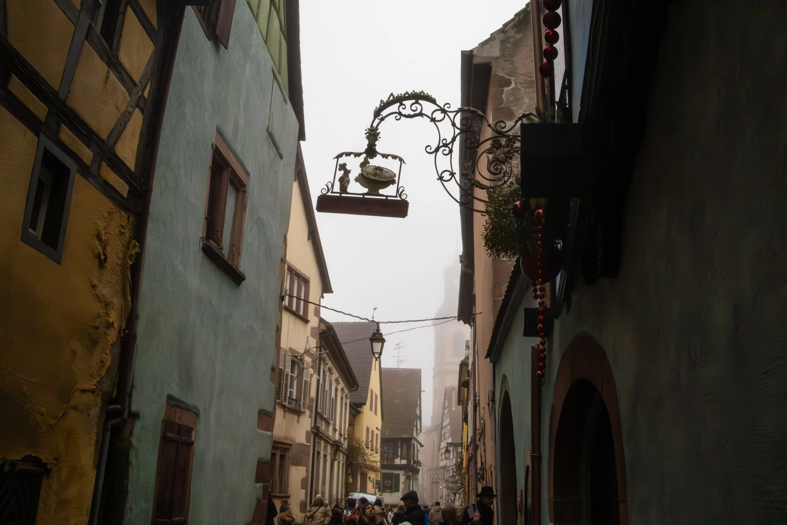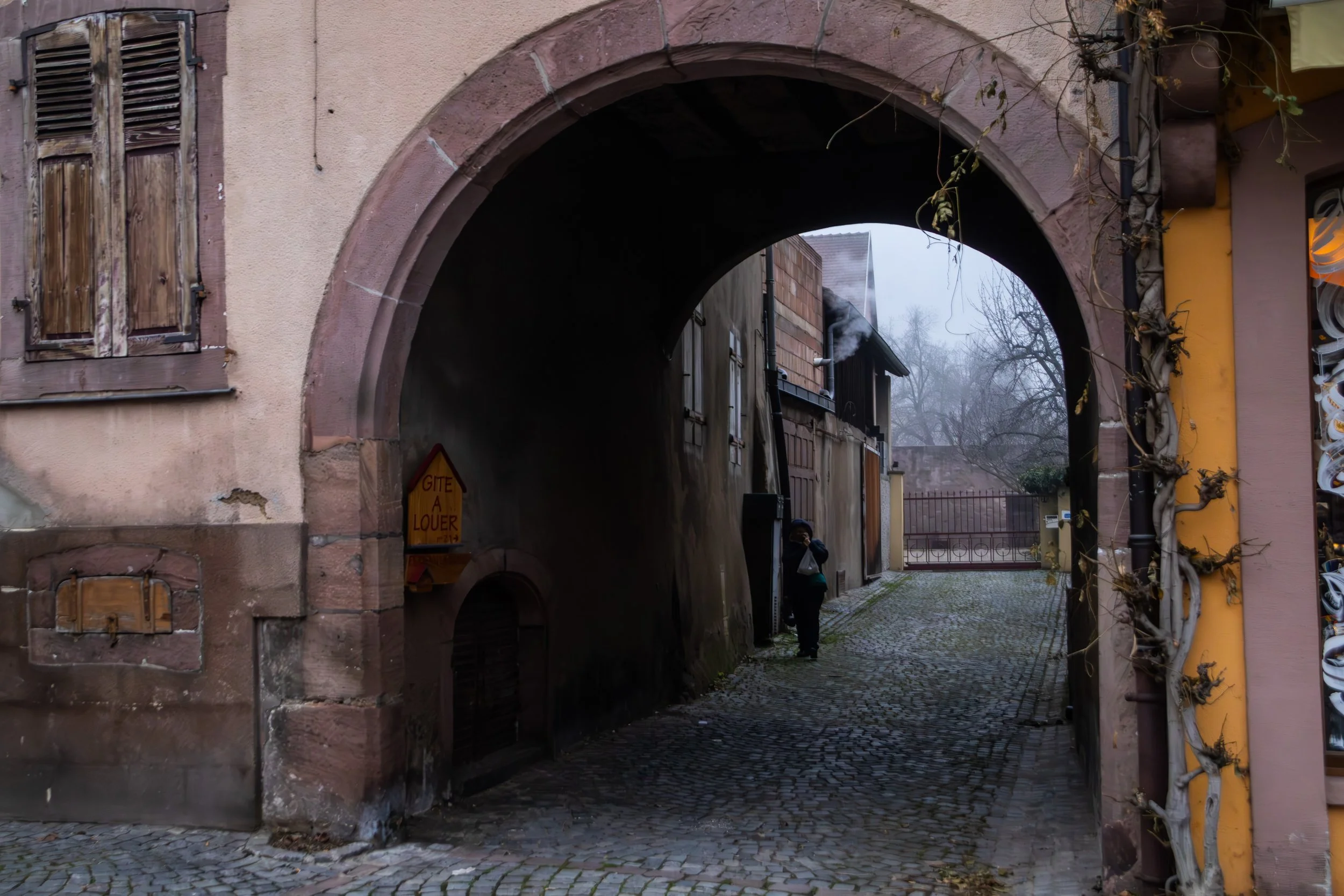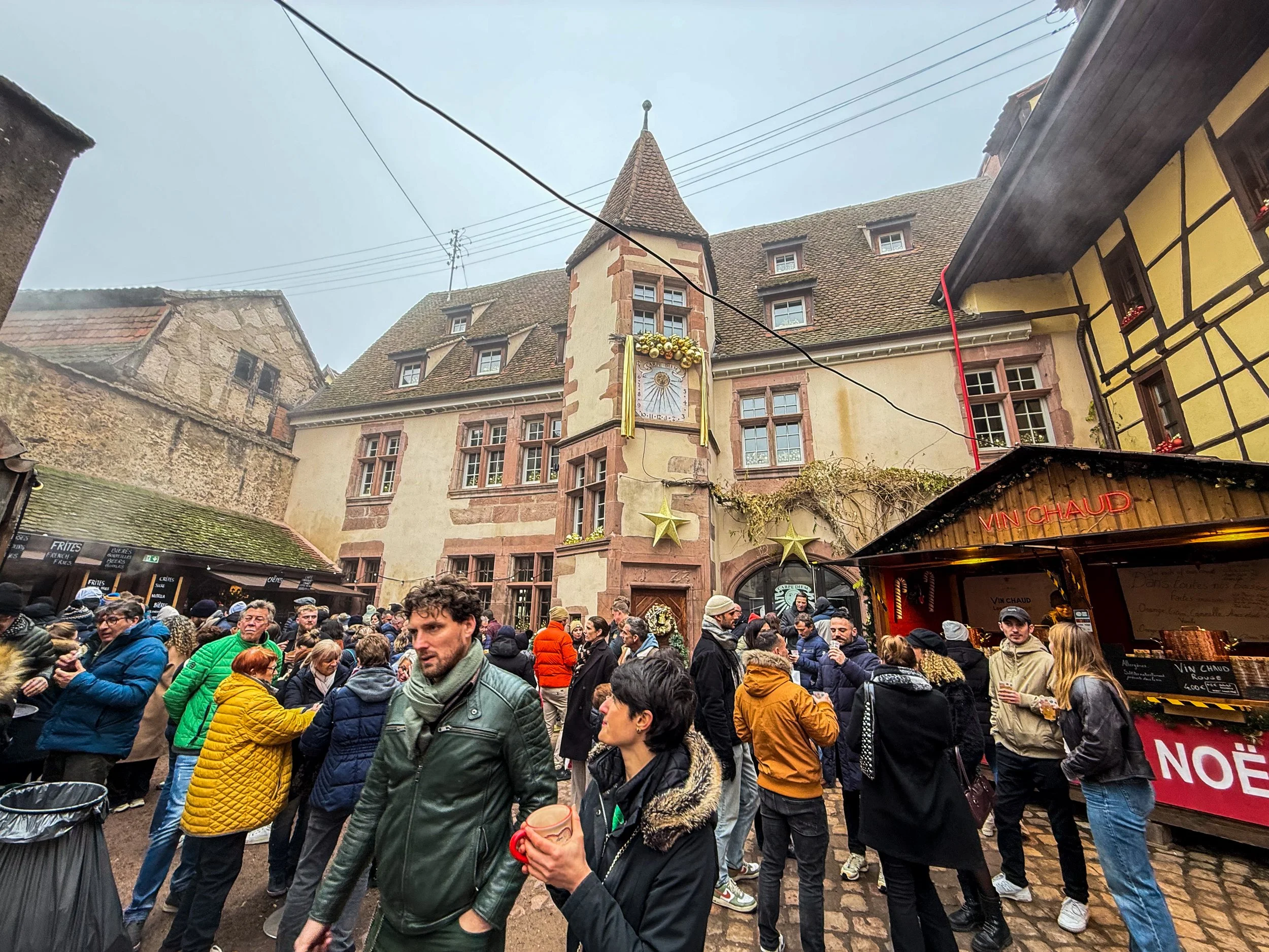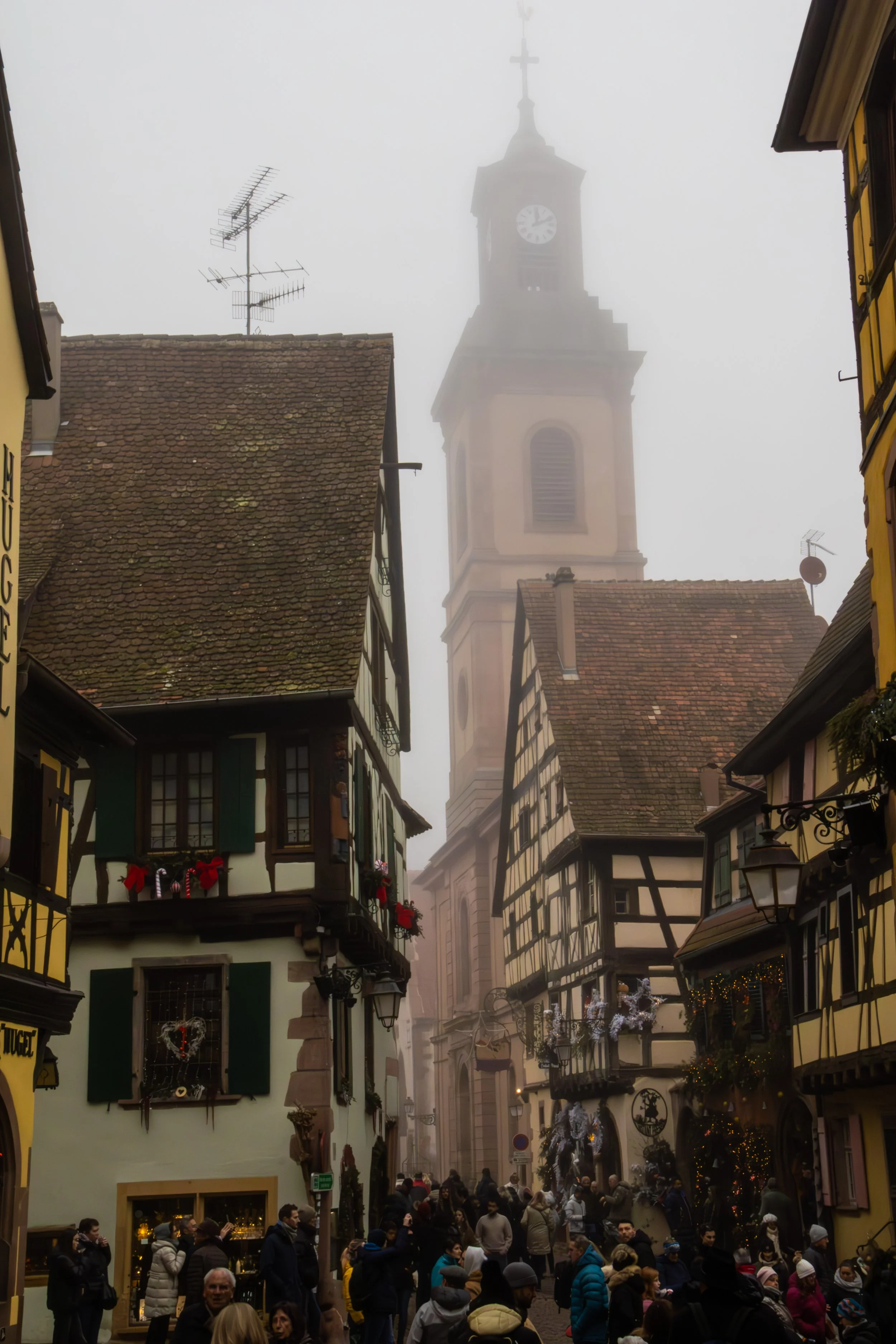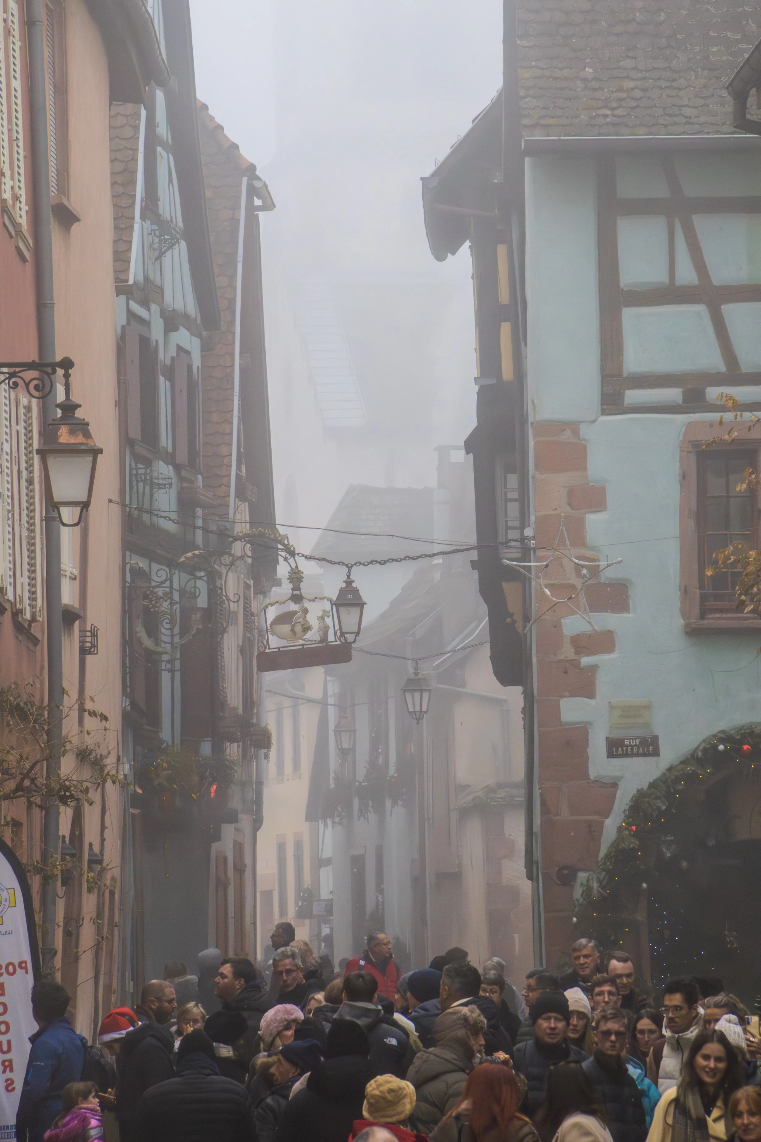 So, by the time we arrived at the entrance to the medieval town, there was little doubt left as to whether or not I would be able to find vin chaud here. It was omnipresent in this region, and I as grew ever colder, I became increasingly dependent on it to keep from shivering. But, in the dreary, penetrating cold, the best way to keep warm was to keep moving, and the charm of this town provided plenty of potential destinations. The gallery below will move chronologically, starting with the foggy vineyards, walking through the outskirts of the town, eventually entering the bustling Christmas Market at the town’s center.
