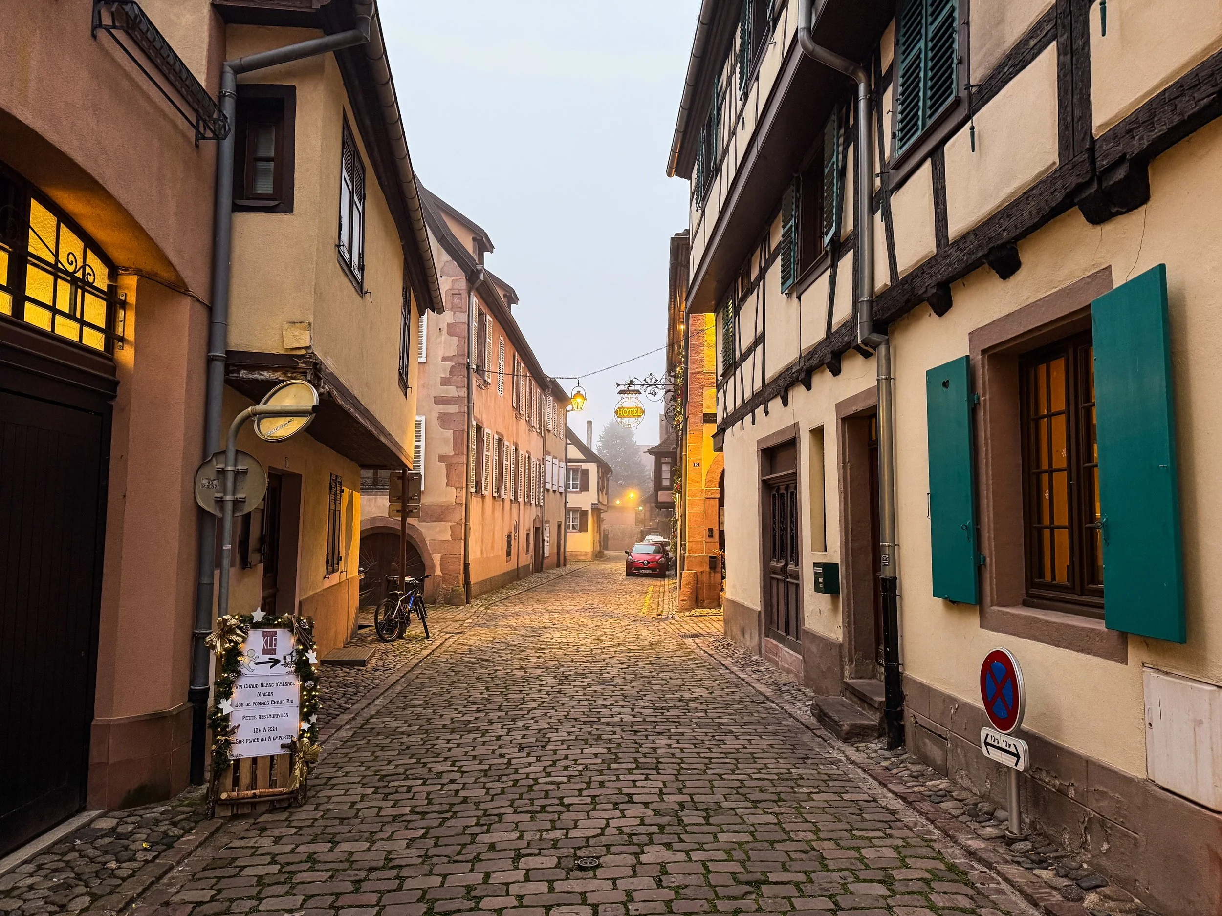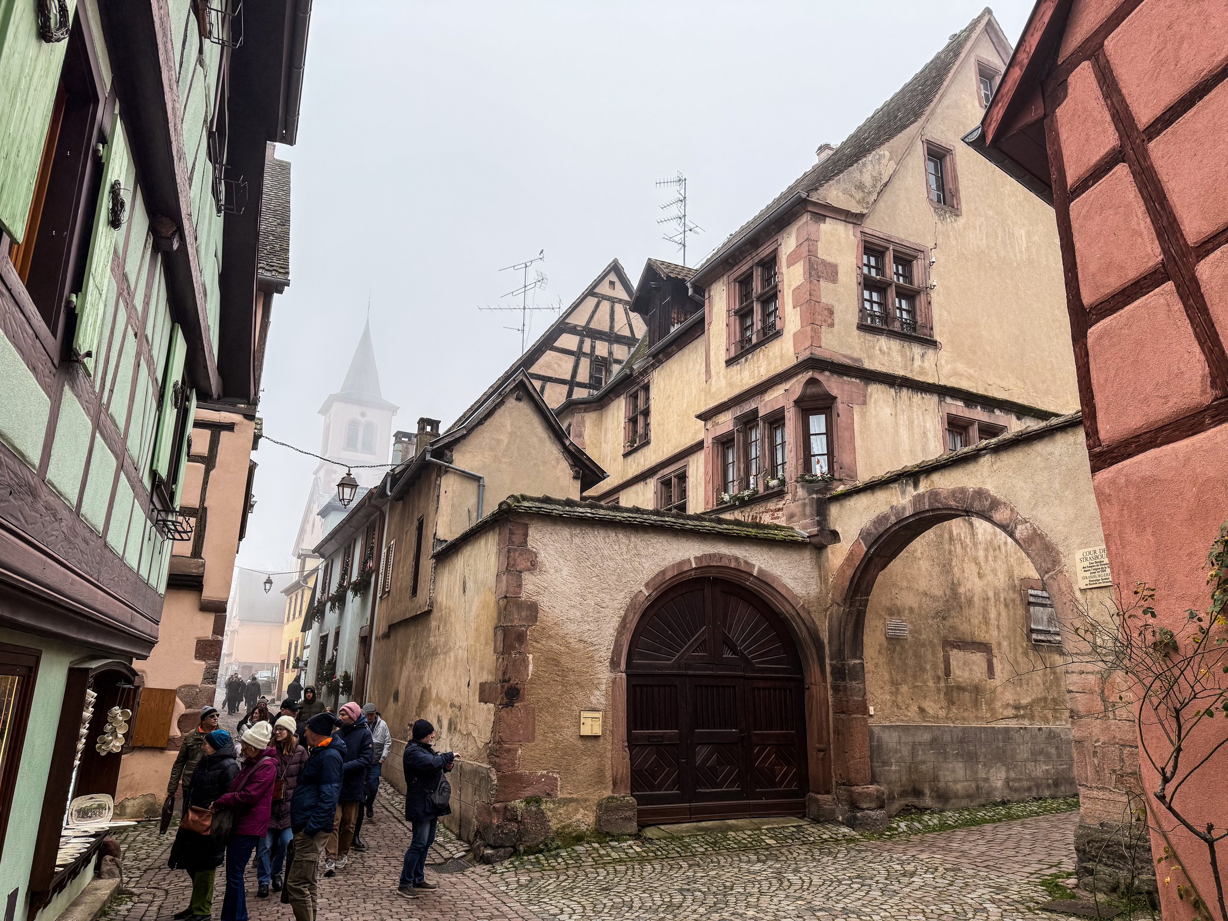 Another drawback of the fog was that it made driving a bit scary. Driving south from Strasbourg to Riquewihr, it was basically white-out conditions. But gazing out the windows as the charming, fog-covered farm fields flew by was still quite beautiful and thought-provoking. You don’t get to experience this kind of weather too often. I couldn’t help but reflect that these fields under this cold fog reminded me of scenes from certain WWI and WWII movies I’d seen. It’s hard not to have these conflicts top-of-mind as a visitor here.