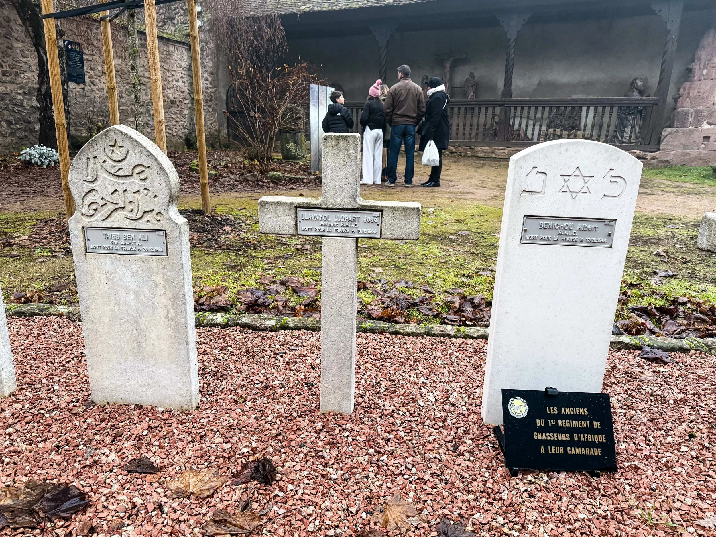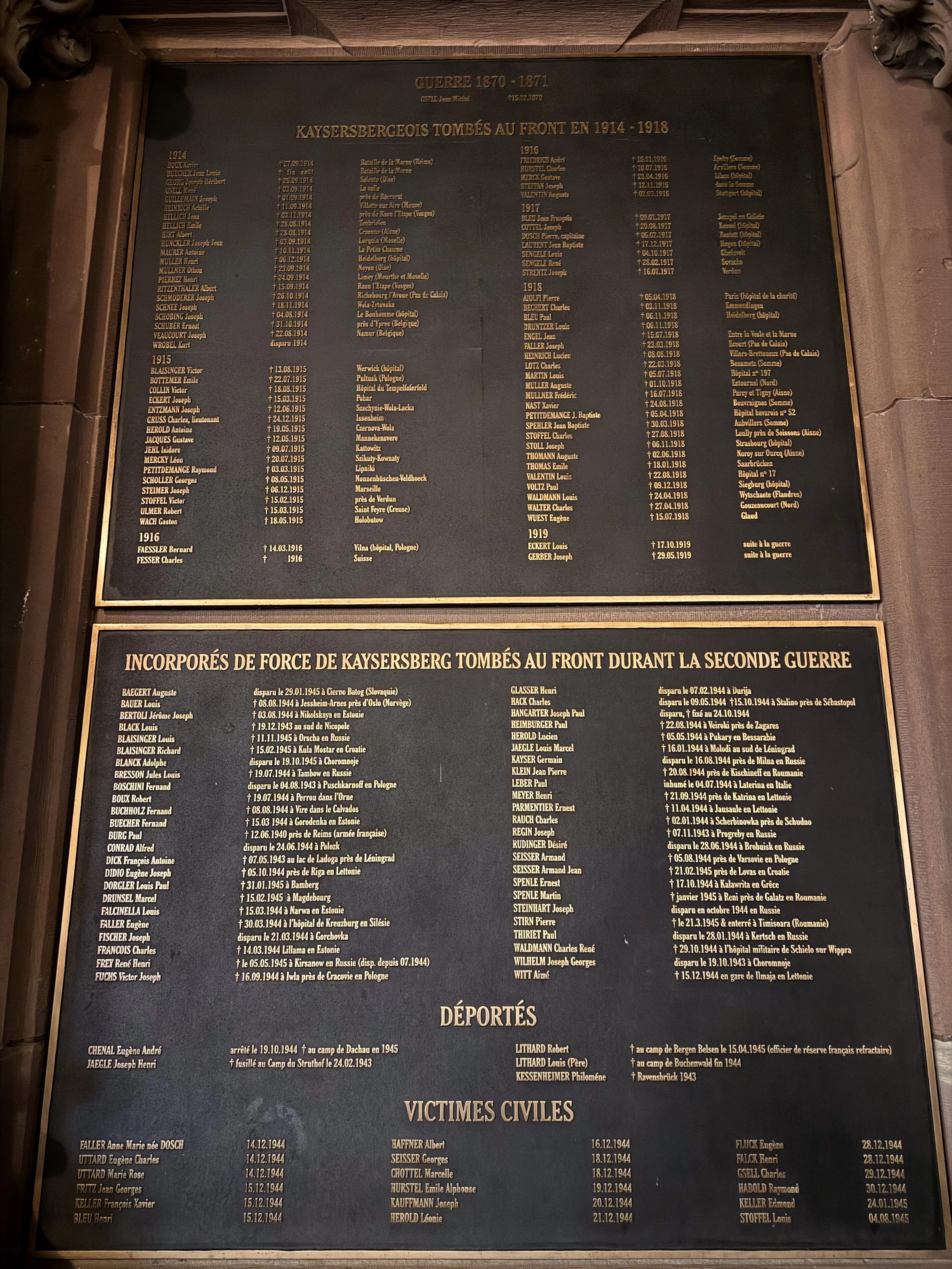 In the early days of WWII, the Nazis rapidly took back Alsace-Lorraine, and they didn’t just occupy the territory like they did in other places; they fully annexed it and began to integrate it back into the German Reich. Just as the French had suppressed the German language, the Germans now banned the French language. But it didn’t stop there; the Nazis needed soldiers, so they forcibly conscripted thousands of Alsatian men into the Nazi army. These Alsatian conscripts were known as “Malgré-nous” (“Despite ourselves”), and many of them died in the war, including on the Eastern Front. So, this is how we end up with this sign, explaining which flag each of these boys from Kaysersberg died fighting for. It’s really sad. Somebody needs to make a movie about two best friends in this village who end up fighting on opposite sides of this war. I would watch that movie… and I would WEEP.