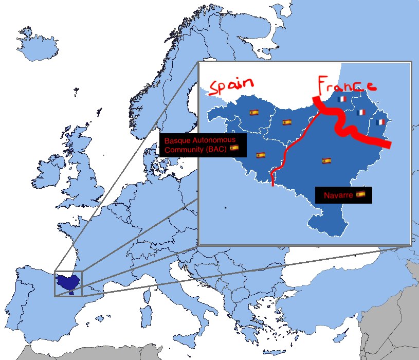 Please appreciate this map of greater Basque Country that I doctored up to make the delineation between the French and Spanish side more clear. This is the first time I have had to go rogue on the map-making for this blog. 😂