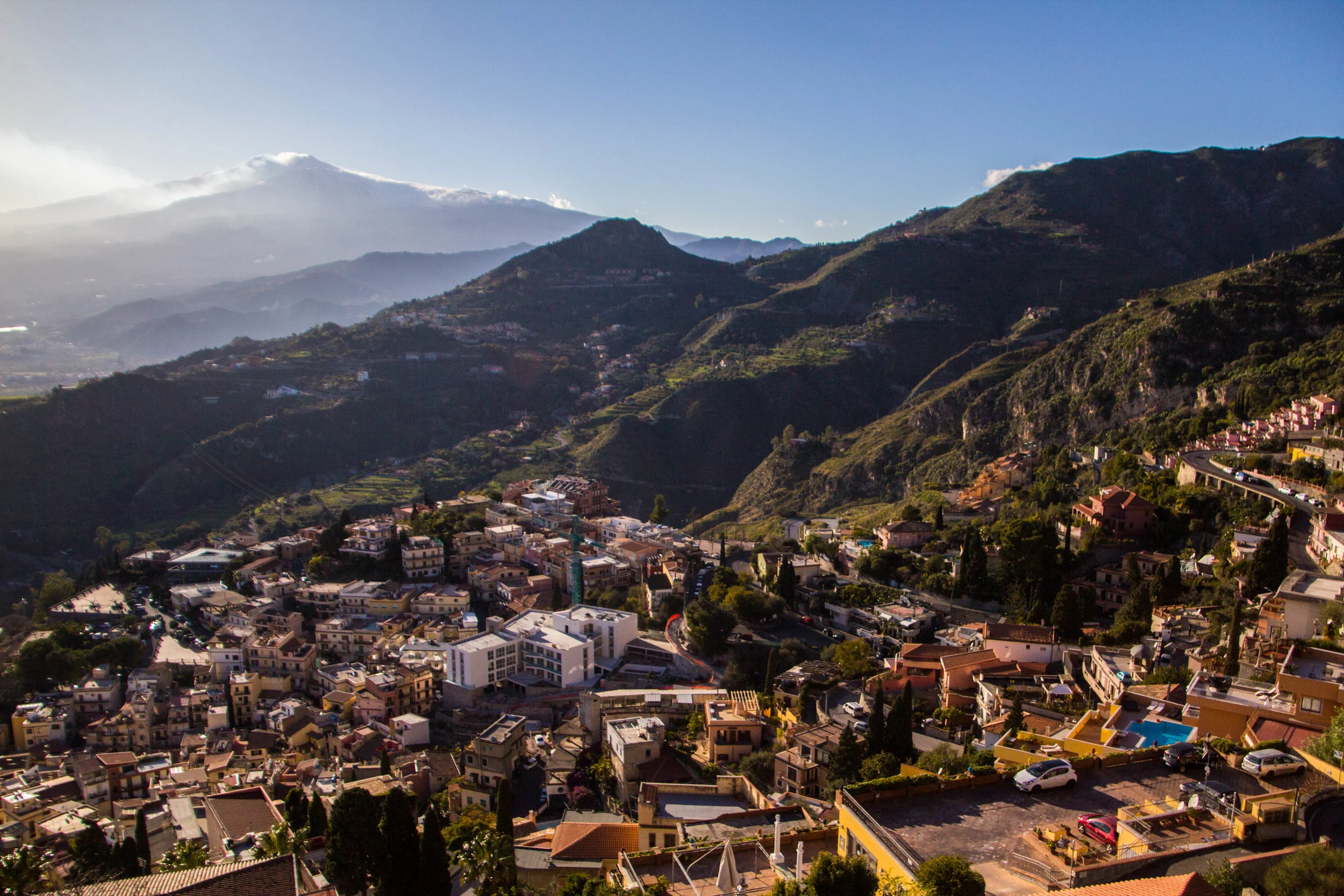 The first thing we realized about Taormina as we made the steep ascent into town was that the mountains around here are no joke. The town of Taormina sits on rocky cliffs that tower nearly 900 feet above the Mediterranean Sea. Winding our way around this mountain side, we took a few wrong turns before eventually finding our way into town. And that's when the cliff-side search for parking began. The roads were narrow but smooth, and driving around the Taormina area, we frequently passed lavish houses that must have had incredible views. This place was already shaping up to be great day-dream material.